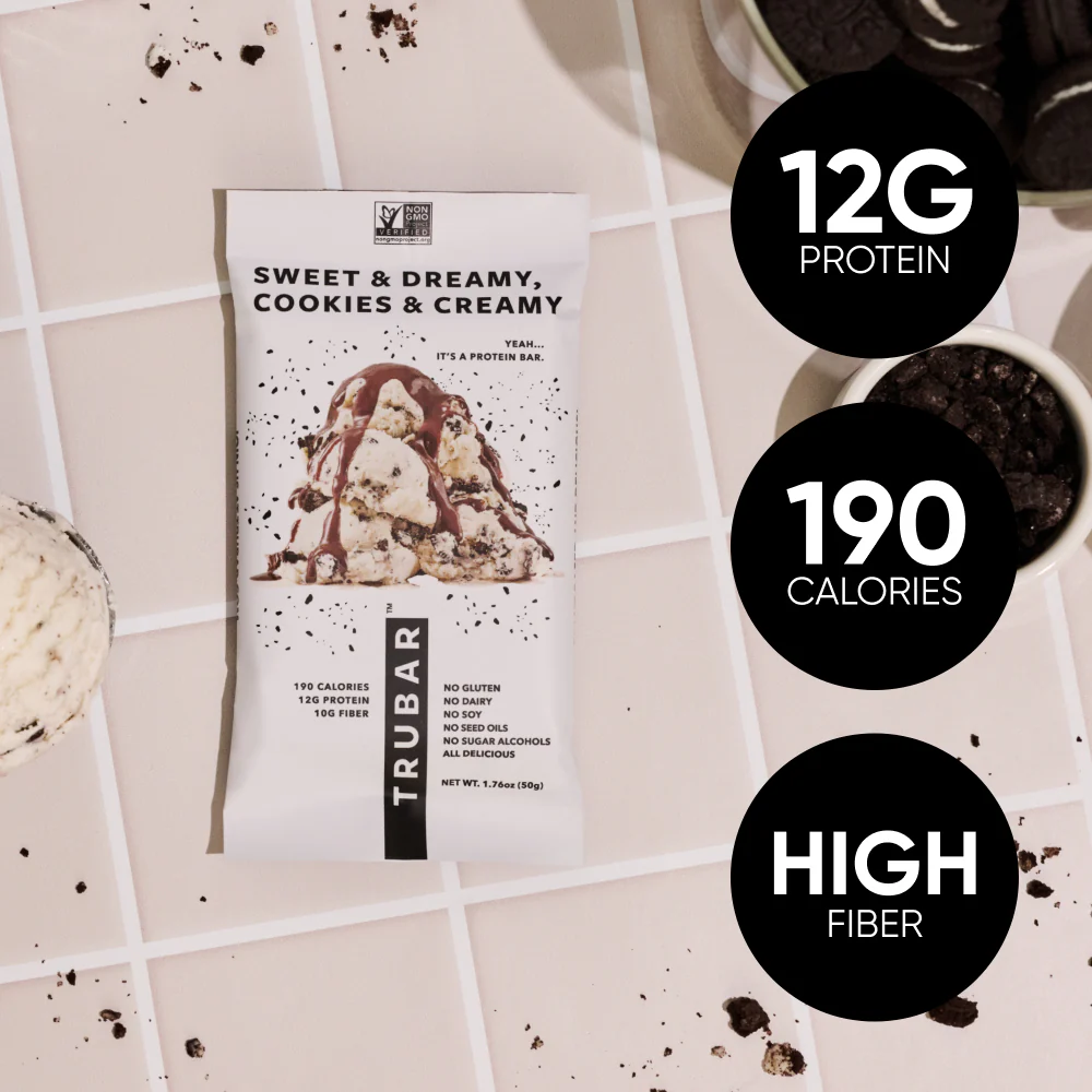 The TRUBARĀ Sweet & Dreamy, Cookies & Creamy protein bar is a smooth, cookie-stuffed fantasyācreamy, crave-worthy, and completely guilt-free.